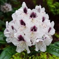 Увидев цветущие садовые рододендроны сорта Кальсап, можно потерять спокойный сон из-за желания пополнить свою цветочную коллекцию этим фантастическим экземпляром декоративных! Компактный полутораметровый кустарник настолько усыпан огромными соцветиями, что за ними даже не видно листьев. Но изюминка растения не в этом. А в чем? В удивительном окрасе! На фоне искристо-белых лепестков, слегка подкрученных по краям и имеющих едва уловимый розоватый оттенок, нет ни намека на другой цвет. Хотя минуточку! Посмотрите на верхний лепесток: он не такой, как все! Его изюминка – наличие насыщенного, яркого и эффектного бордово-фиолетового крапа-принта, который издали похож на прекрасный глаз.