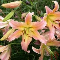 Не понимаете, о чем идет речь? Тогда знакомьтесь: экстравагантная и фешенебельная лилия Элюзив, относящаяся к группе «ОТ-гибриды». На ее высоком полутораметровом стебле в первом месяце лета распускается невиданная красота – огромные бутоны, состоящие из 6 слегка волнистых лепестков. Но вся фишка кроется в их окрасе! На лососево-розовом фоне в самом центре лепестка разместилась оранжево-желтая полоса и множество мельчайших «веснушек»-крапов. А тончайшие темно-бордовые пыльники придают соцветиям еще больше пикантности и изысканности.