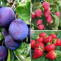 В состав комплекта входят: Малина Полана (супер ремонтантная), Клубника Хонеойе/Ранняя и Слива Чернослив