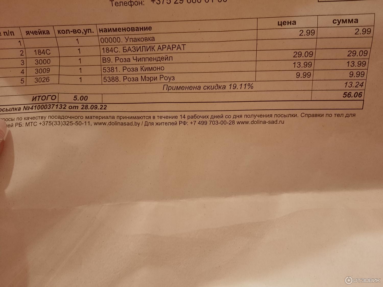 Хочу поблагодарить питомник за качественные саженцы роз. Упаковка отличная. Всё упаковано в коробку. Саженцы целые и свежие. В коробке чек-квитанция за товар. Девушка оператор ответила по телефону на все вопросы. Подсказала и научила как оформить заказ. Спасибо отдельное за подарочек (семена базилика). Процветание Вашему питомнику.
